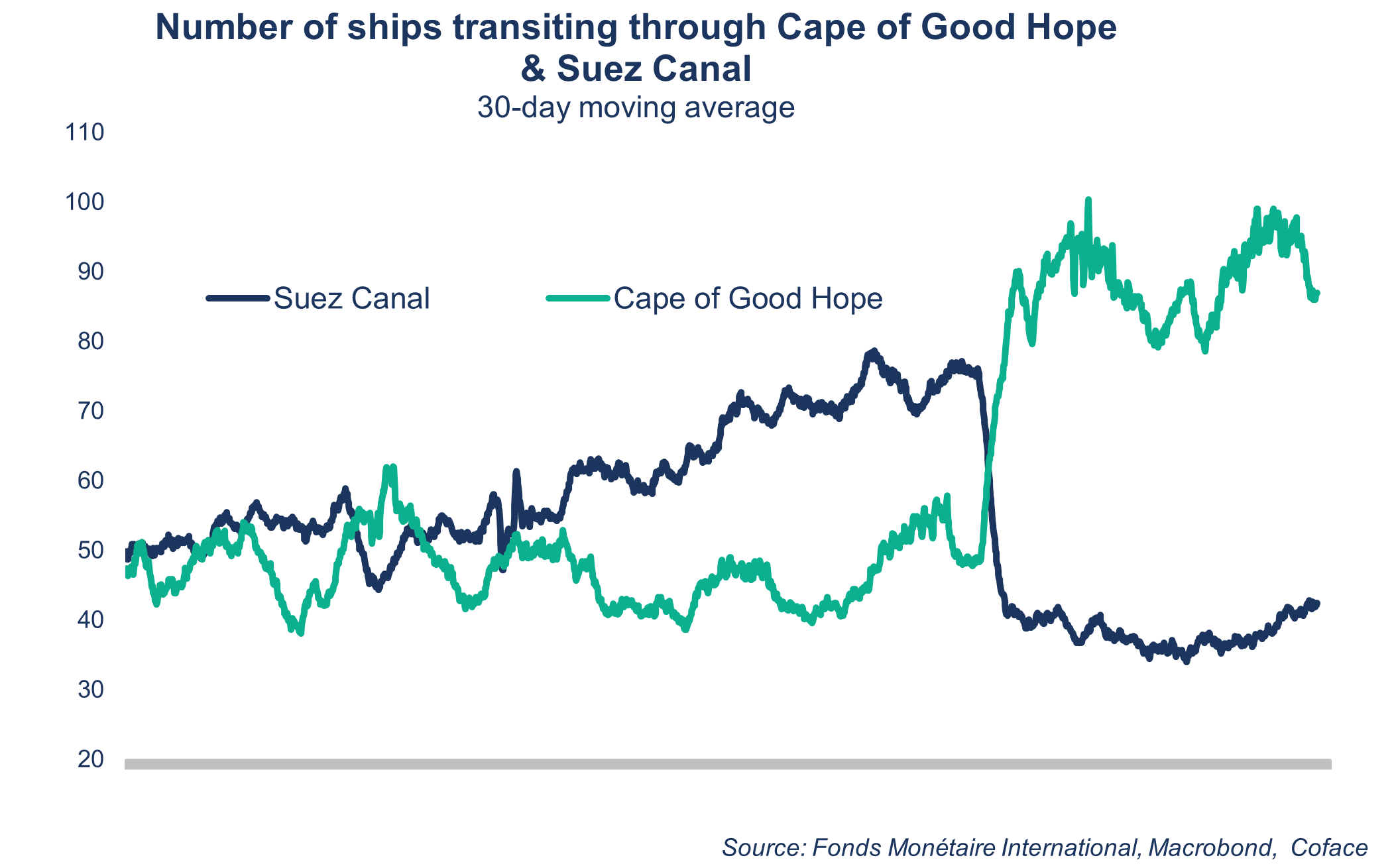 • 12% → 9%: share of global maritime traffic passing through the Suez Canal, which has been falling since the Houthi attacks in 2023.